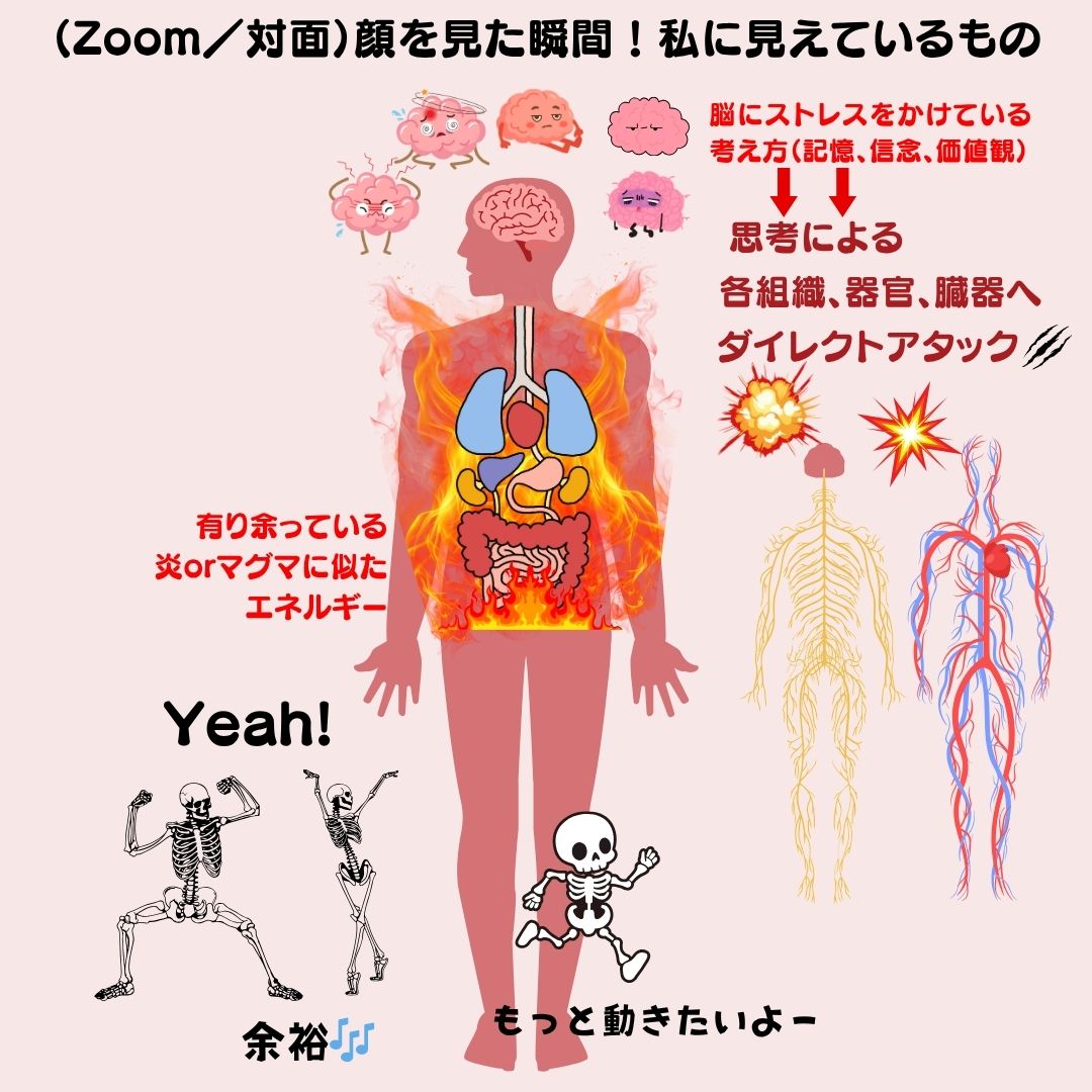 こんにちは!と挨拶した瞬間に見えてくるというか、全身に飛び込んでくる皆さんの全身(エネルギー)の状態です。セッションに来られた方のテンション、表情、状態がどうであれ、私が驚きとともに笑ってしまうのは、未使用のまま有り余り、体内でボウボウと燃え盛っている炎/マグマ(ひとによる)と、骸骨で表現しましたが、芯/骨の組織のもと?細胞たちのノリノリのエネルギーです。このような姿?を見せられるんだもの。私にしてみたら、この人は大丈夫に決まっている!ってなるのわからなくもないでしょ?(^^)。