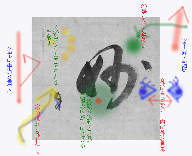 書全体からは「静まれ」という意識と「上昇離脱」の動きを感じます。自分の周りがうるさいと感じたり力で押さえつけようとしたりするのはお門違いであり、突き詰めれば自分の心がうるさいだけなのだそうです。うるさい自分の心から離れることが出来たなら心地よい静寂の世界が待っているという意味です。
