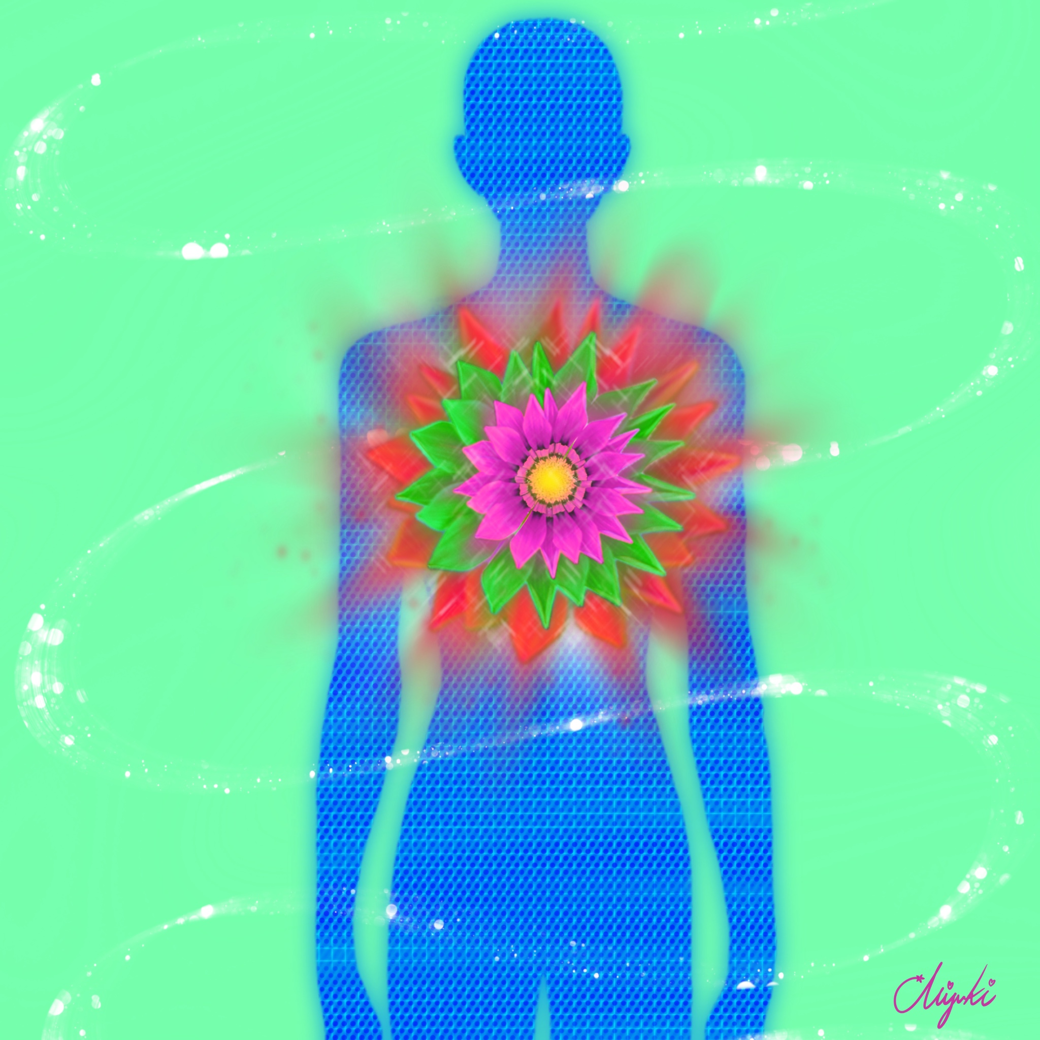 あなたの肉体が送ってきた映像(状態)をそのままイラストにしました。伝えてきたエネルギー(訴え)をストレートに表現しますと、『胸にある大きな花(ハートに創った花=造花)が邪魔(不要)!!』だそうです。