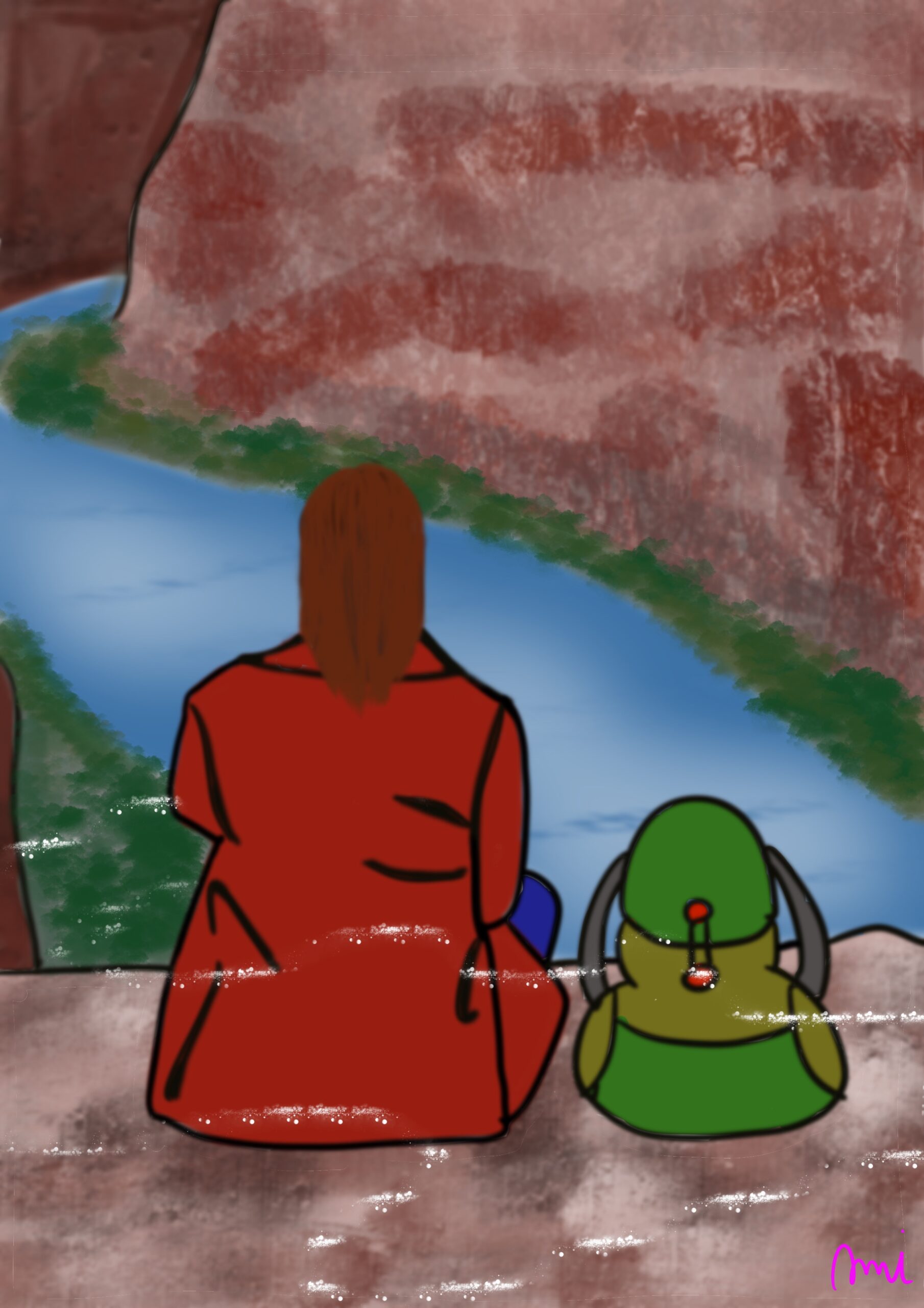性別が不明なくらい大きく逞しい後ろ姿は、あなたの肉体&精神の逞しさ、そのものを表したものだそうです(笑)。後ろ姿なのは、この逞しさを認めていない(直視していない)から。また、あなたの身体は旅に出たい(移動したい/行動を変えたい)と言っているのに、あなたは”高みの見物”をしながら、”高い。怖い。下に降りたら、流されちゃう(溺れちゃう)かも。”と心配事ばかり並べ、立ちあがり歩くことを阻止しよう(邪魔しよう)としているとあなたの身体が文句を言っています。