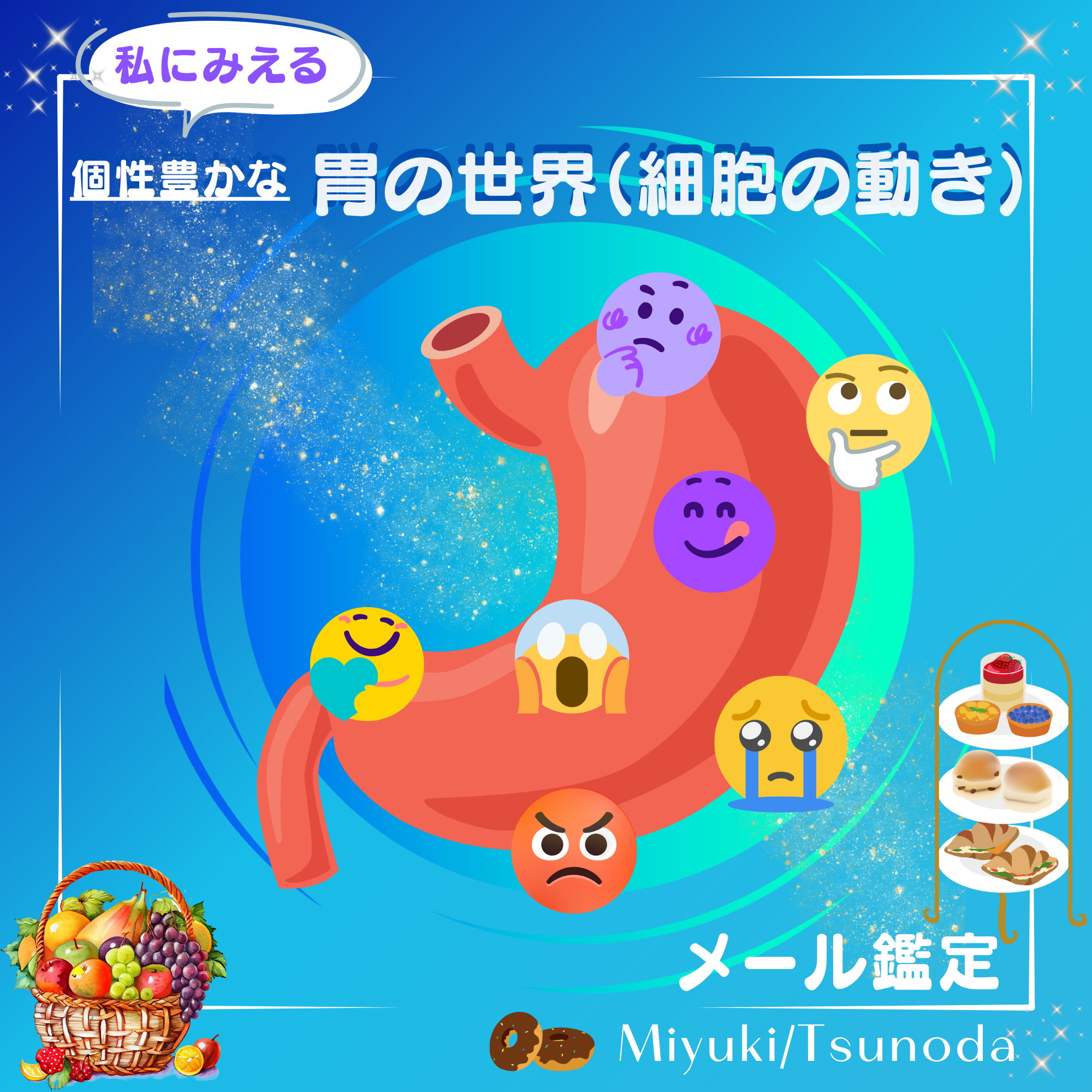今、どういう状態にあるのか、どこを活かし、何を止めるべきか、人間的な部分(本人)に自覚してほしい、個性(動き、働き)などなど、私が受け取れるあなたの胃の世界(細胞、エネルギーの働き)をメールでお伝えします。