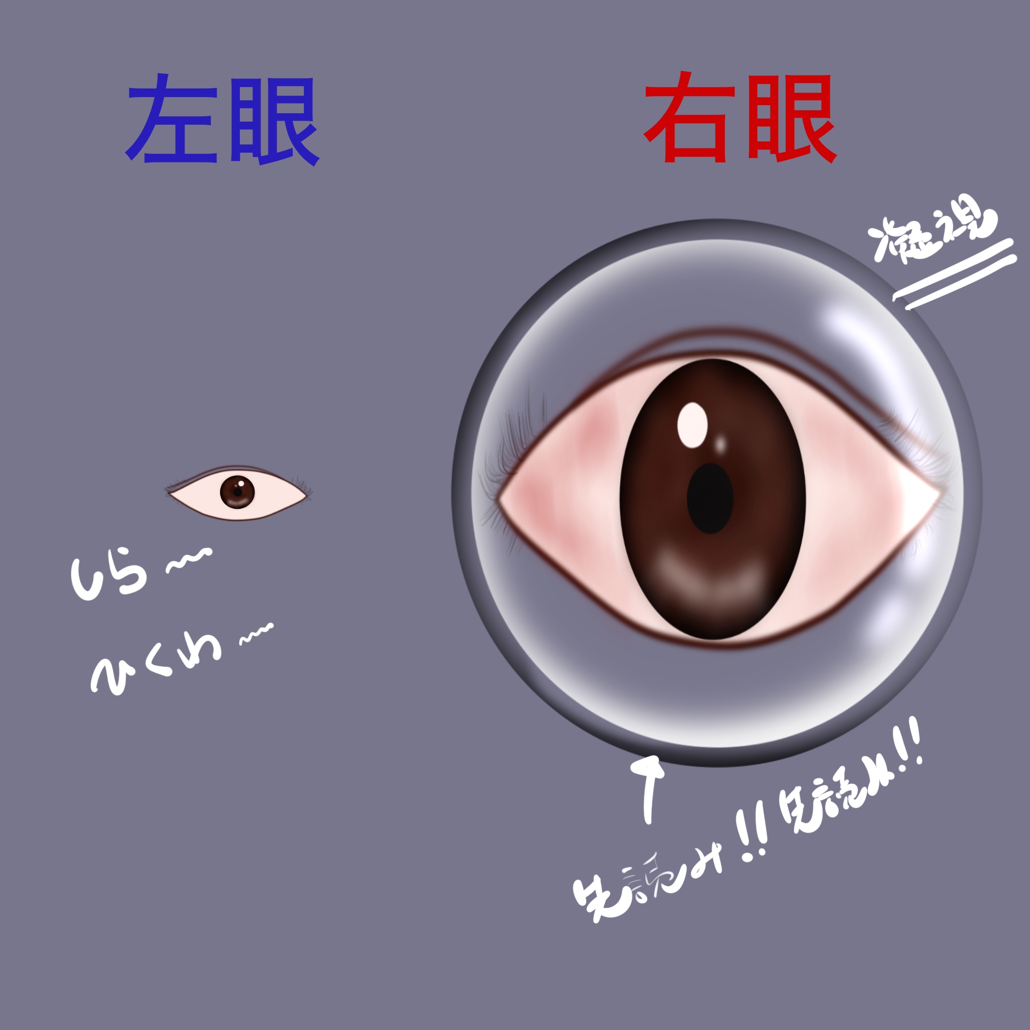 あなたの左眼、右眼をそのまま鏡を見るように描いています。右眼は、マイクロ望遠レンズを覗いている状態です。できる限り先読み(未来を予測)し、行動しないと!ちょっとした危険(間違い)=これから先に起こりそうな情報はどこかに絶対落ちている!見逃しちゃダメ!と目にサイキック的なアンテナを張り、探偵さながらの虫眼鏡(マイクロ望遠レンズ)を右眼に貼り付けてけています。