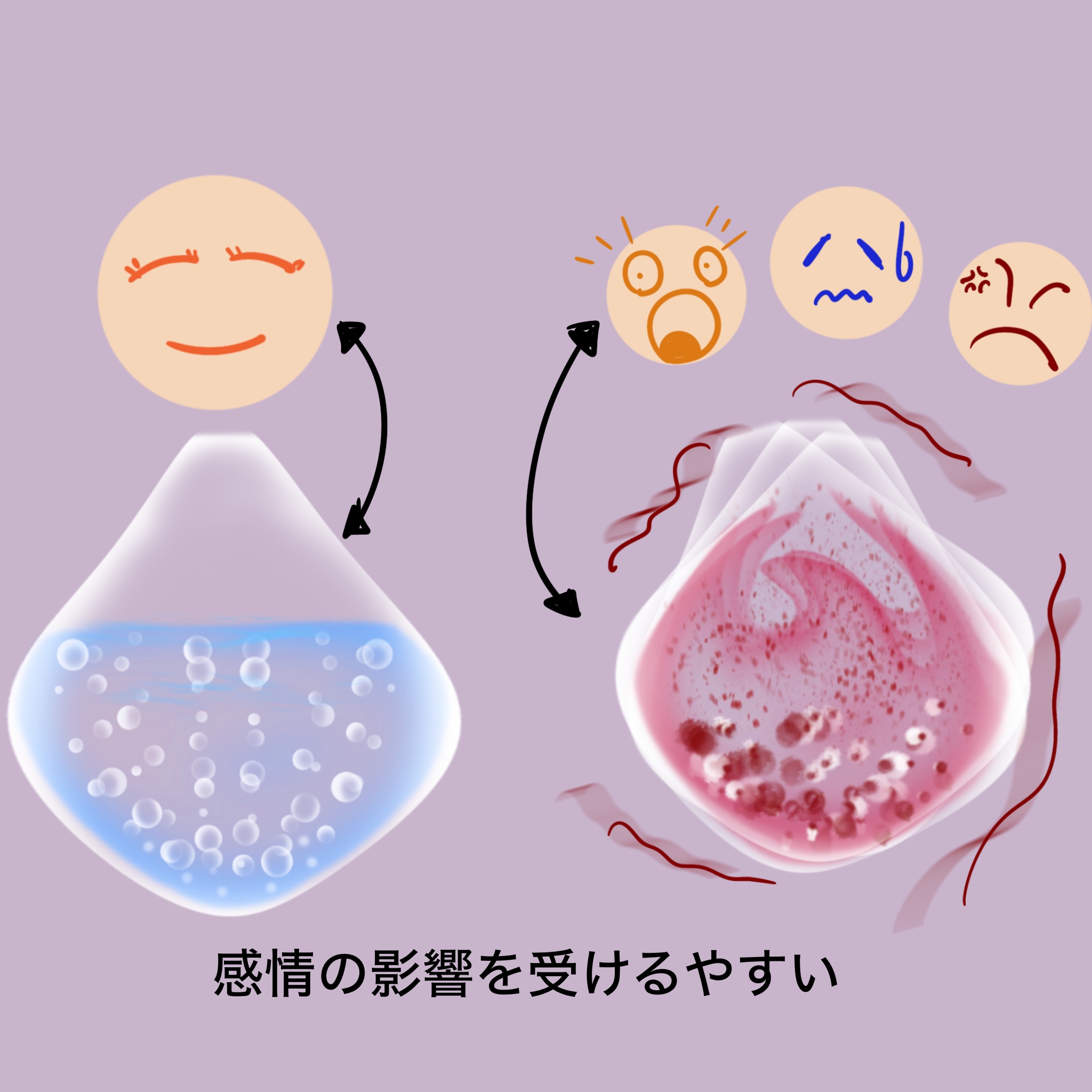 胃自体に問題はありませんが、水を蓄えるという新しい胃になったため、胃が以前より感情の影響を受けやすくなりました。右側のイラストをご覧ください。胃というよりも、胃の中の水があなたの感情によって大騒ぎします。静かな湧水が、荒れ狂う海のようになってしまうのです。短時間なら問題ありませんが、長引かせると痛みや吐き気、芯からくる寒気(震え)などの症状が出てくるようです。あなたの胃は弱くもないし、悪くもありませんので、胃に関する症状が出たら、直近のあなたの行為・行動に改善するべきヒントがあるはずなので、気にしてみてください。