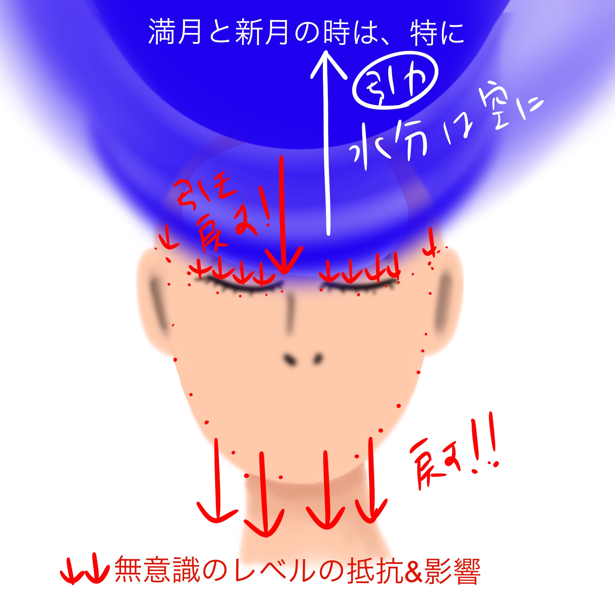 特に、満月と新月の時、海水も月に引っ張られるという大きな力(引力)が働いているため、脳の抵抗も強くなっているはずです。寝ている時に無意識のレベルで、あなたの目=ギューーウと力を入れ瞼を閉じることで、脳の抵抗を応援しています。そして、その目(瞼)の応援団に触発されるように顎全体がギュウっと引くこと=力を入れることで応援団に参加しています。