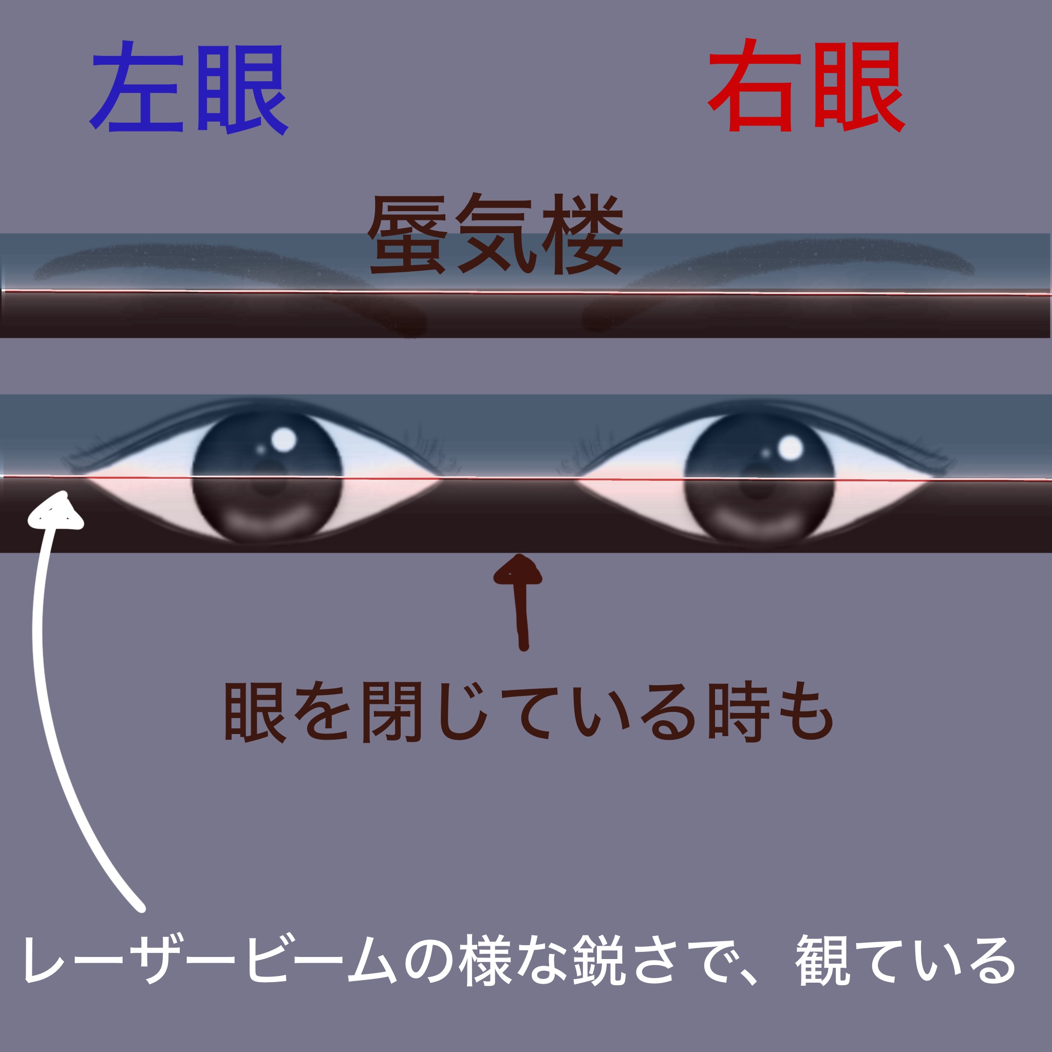 この目の中心にある水平線/地平線のような隔たりが、目を上下に真っ二つに切り裂くレーザービームのような緊張となって、瞼を閉じた時に網膜がピキーんという軽い痛みとともに引きつり、目が開きにくくなっているようです。