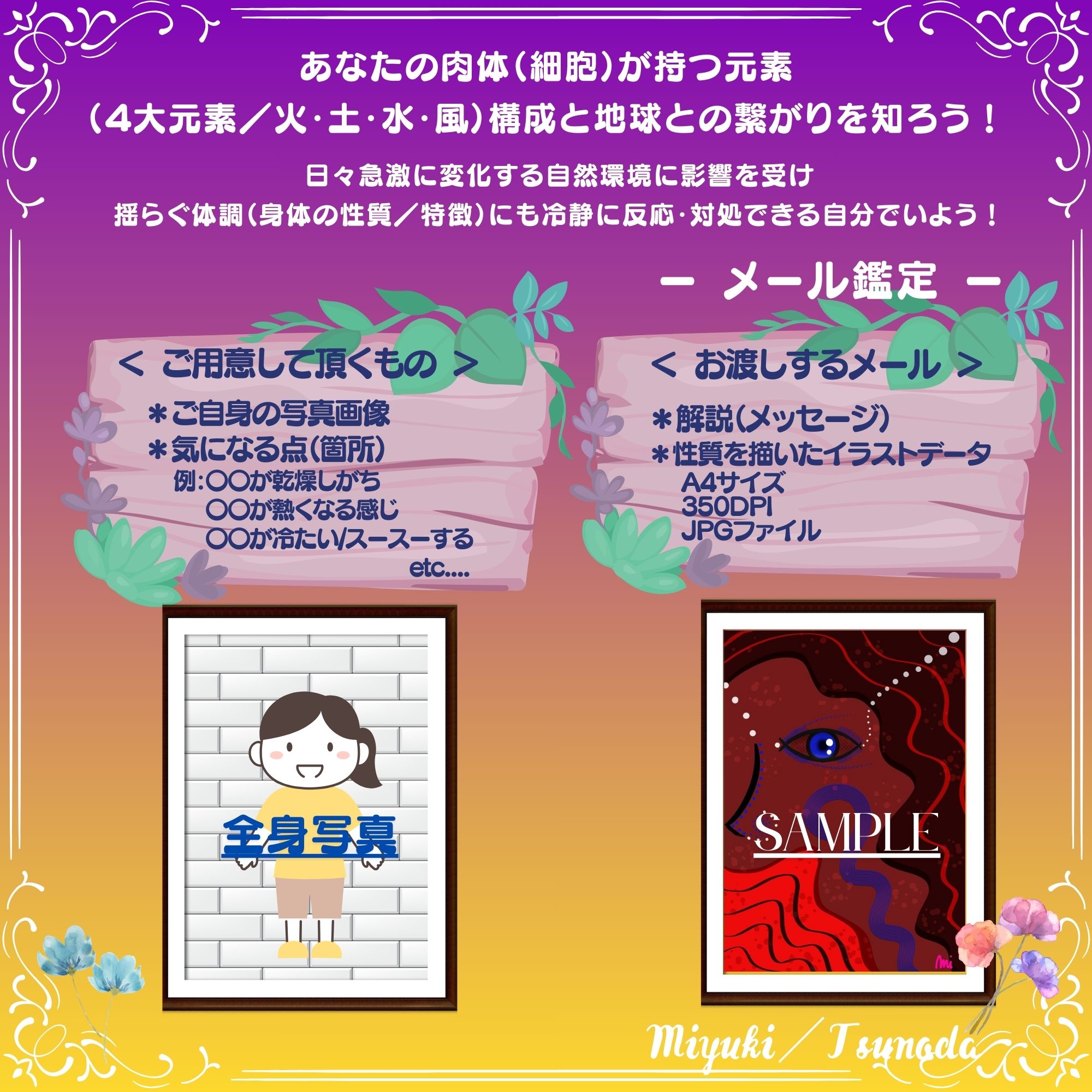 あなたの肉体(細胞)が持つ元素(四大元素/火・土・水・風を基盤に)の構成と地球との繋がりを知り、日々変化する自然環境とその影響を受け揺らぐ体調(身体の性質/特徴)に冷静に反応、対処する自分でいよう!というメール鑑定です。