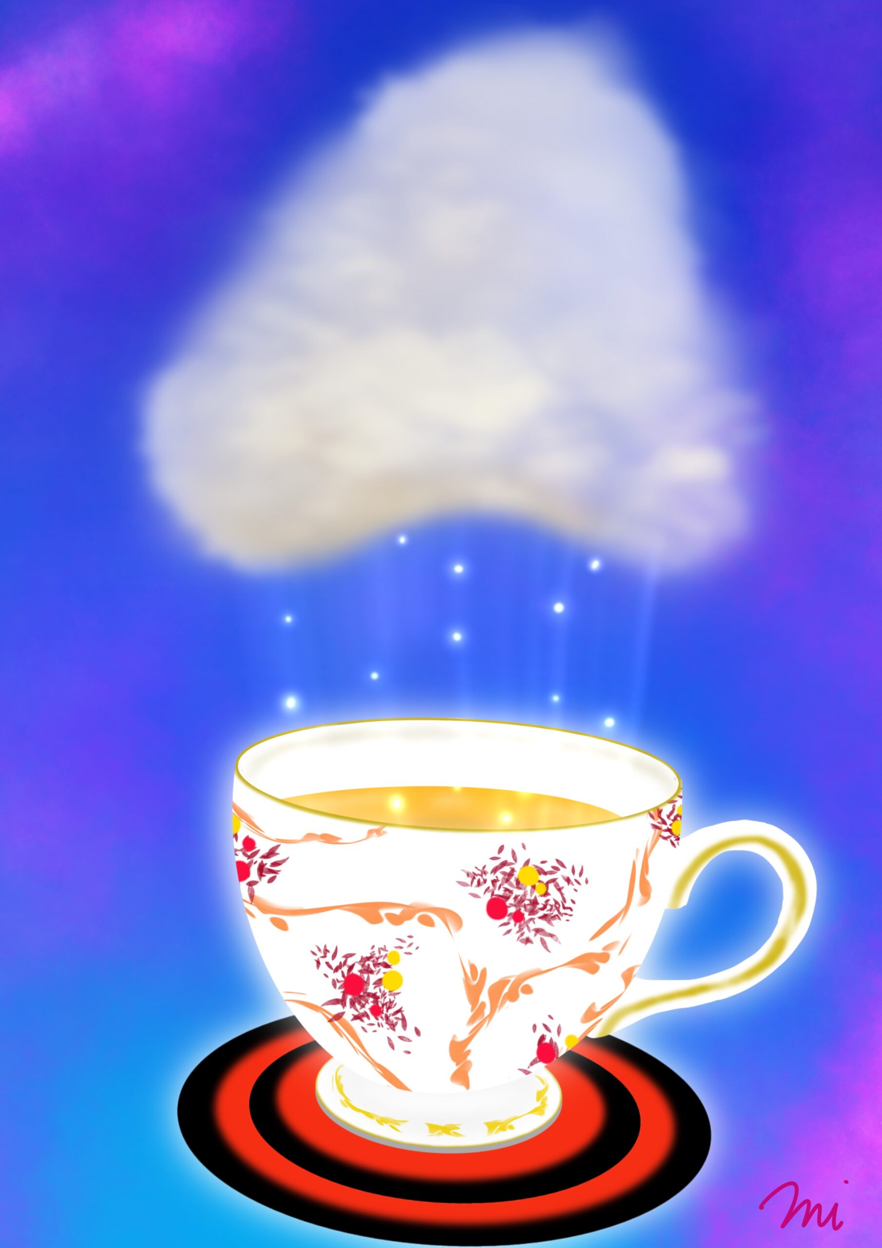 ティーカップ用のIHレンジで紅茶(水)を熱しています。それが蒸気となってカップの上に雲ができています。