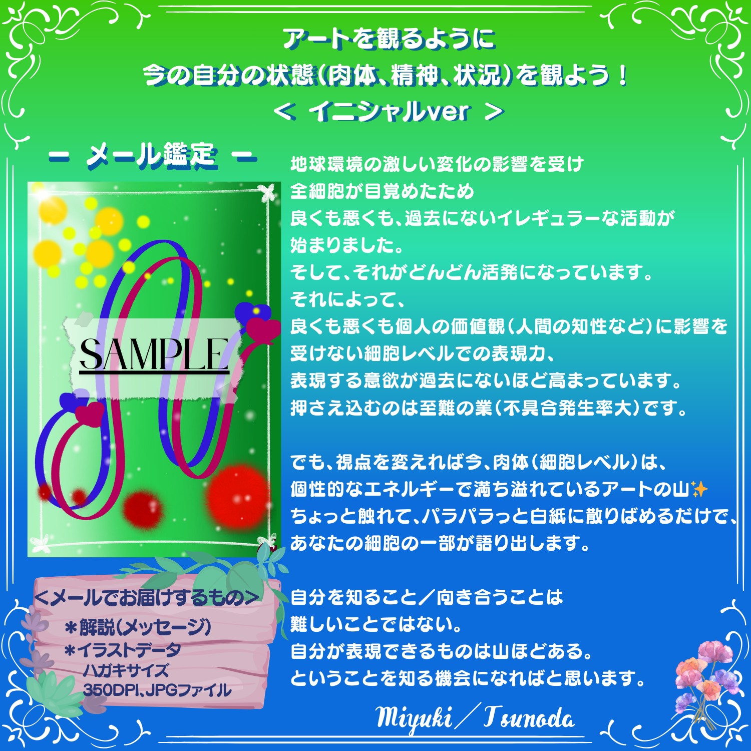 去年、臓器と話をしてきた私が今回、イニシャルをイラストにするという非常にシンプルなメール鑑定を作ったのは、自分を知ること、向き合うことも今、難しいことではないということ。