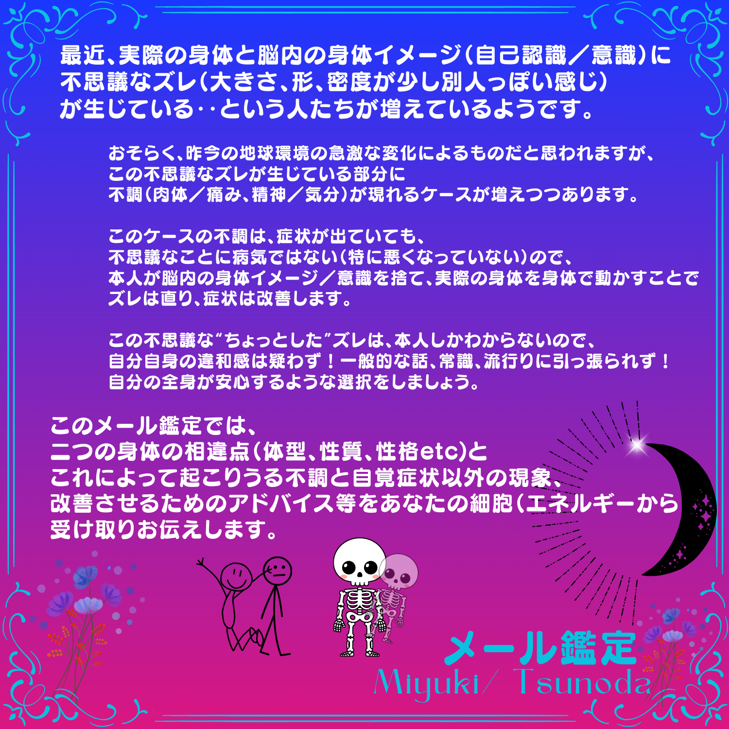 二つの身体の相違点(体型、性質、性格など)とこの違い(ズレ)によって、起こりうる不調と自覚症状以外の現象、改善させるためのアドバイス等をあなたの細胞(エネルギー)から受け取りお伝えします。